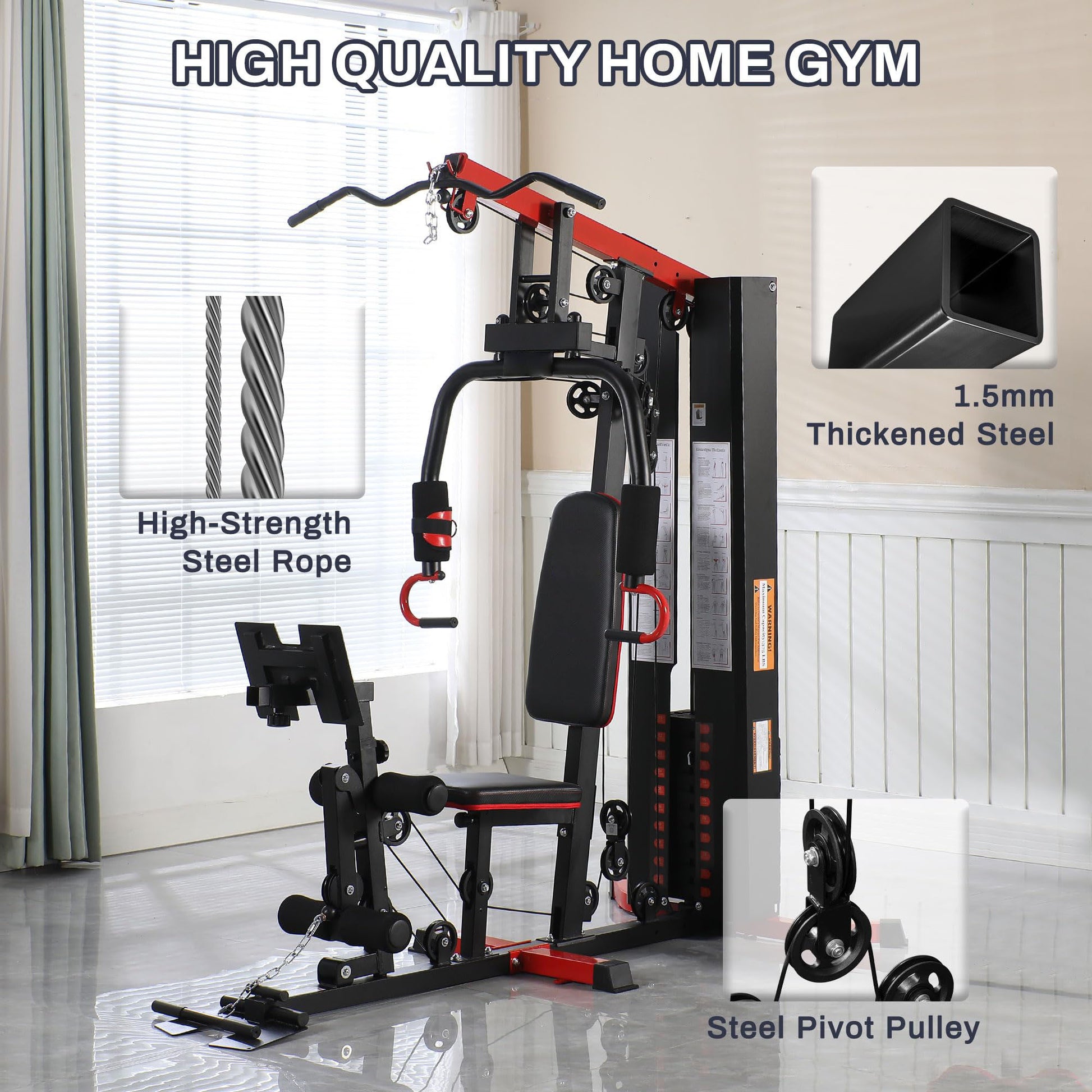 Take your strength training to the next level with this Heavy-Duty Home Gym—a compact, cable-driven powerhouse built for real results. Engineered from high-quality steel with aircraft-grade, nylon-coated cables (tested to 1,000 lb), this system supports users up to 400 lb and offers a gross training capacity up to 1,000 lb. A smooth 15-pulley layout and included 122.5 lb vinyl weight stack deliver up to 330 lb of resistance, so you can progressively overload every major muscle group—safely and efficiently—without leaving home.